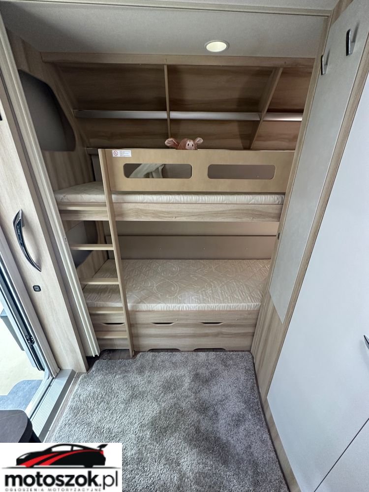 Komfortowy model 490 KMF DE LUXE to sypialnia z łóżkiem małżeńskim poprzecznym na szerokość całej przyczepy. Wygodne 2 ławy ze stolikiem zapewniająca dodatkowe 1/2 miejsca do spania, 2 x łóżko piętrowe dziecięce o dł. prawie 200cm oraz szer. 80cm. W pełni funkcjonalna, zintegrowana łazienka z brodzikiem z umywalką oraz z WC THETFORD.