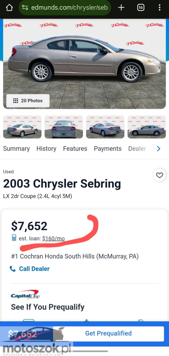 Dla miłośników rzadkich Amerykańskich sportowych samochodów mam do zaoferowania "Chrysler Sebring Coupe Limited Edition", 2004, rzadką spotykana wersja z silnikiem Mitsubishi 3.0, V6, Moc 203, posiada instalację LPG. Do zdjęć dodał jak przykład ile taki samochód kosztuje w Stanach, to 28 000 zł +- plus koszty dostawy 12 000 i instalacji gazowej od 5000, co pomaga lepsze rozumieć dla czego taka cena jest bardzo fajna z mojej strony, bo samochód naprawdę rzadki i fajny. Jestem osobą prywatną i używam samochód co dziennie na dojazdy do pracy i wycieczki. Samochód nie potrzebuje wkładu finansowego, żadnych błędów na komputerze, silnik pracuje dobrze, jest ten cudowny sportowy dźwięk, automatyczna skrzynia biegów pracuje idealnie, rok temu wymienione wszystko co tylko można, zawieszenie nowe, piasty kół, amortyzatory, łożyska, łączniki stabilizatora, guma stabilizatora, tarcza i klocki, opony, akumulator, alternator, chłodnica i pompa wody, wtryski, kapulka i przewody zapłonowe, świecie, różne uszczelki, rozrząd, podwozie po konserwacji. Dla tego samochód jak nowy w dobrym stanie można spokojnie jeździć wiele lat bo większość podstawowych elementów i części jest nowymi.